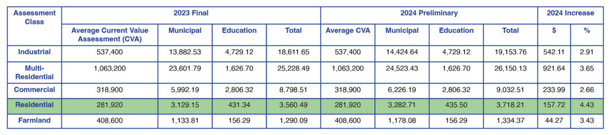 Overall, the increase will work out to an extra $13.14 a month for the average resident, or an overall annual increase from $3,560 in 2023 to $3,718 per residential household in 2024 with a property assessment of $281,920.