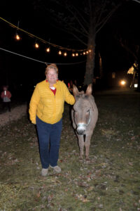 Rev. Martha Lockwood of Central United Church in Welland is posing with the donkey.