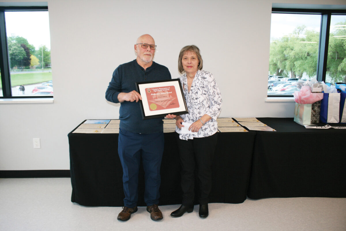 CALEDONIA — The Caledonia Ag Society presented Bryan Tilbury (left) with the Ontario Association of Agricultural Societies Meritorious Service Award at its Member Appreciation Night. Former General Manager Vickie Peart presented the award, stating that Tilbury started on the parking committee and then held various roles, including caretaker, technician, electrician, and more. She described him as a “Jack of all trades”, adding, “We worked as a cooperative team. You knew he would always give 100%.”