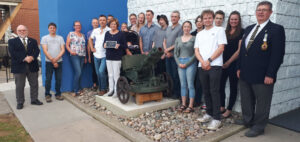 CALEDONIA—This past weekend the Caledonia Legion held an appreciation night where they expressed thanks to those who support and contribute to their club and the Caledonia community. In addition to thanking the Legion’s Ladies Auxiliary for their 73 years of service, presentations were made to the DeGelder Family, Jeff’s Outdoor, and the Caledonia and District Food Bank. Absent from the evening were Hugh, Debbie and Ken Jones of Jones Bakery, who were also recognized for the numerous ways they have given to the Legion over the years. Legion President Brian Haggith and Secretary Neil Bell are shown above on either side of the Minenwerfer that sits outside of the Legion. A Minenwerfer is a class of short range mine shell launching mortars used extensively during World War I by the Imperial German Army mortar launcher. It was brought over to Canada and was donated by Nick DeGelder, a beloved member of the Caledonia Legion who passed away last December. A plaque recognizing the donation was presented to Nick’s widow, Tineke DeGelder, their three sons, Henry, Gerard, Clinton, and their families (shown above with Haggith and Bell). —Haldimand Press photos by Joanne Dorr.