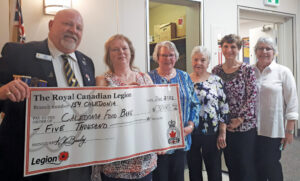 CALEDONIA—Legion First Vice President Ken Burley presents a $5,000 cheque to the Caledonia and District Food Bank. These funds were raised by the Legion through various fundraising efforts, notably their monthly meat draw. With him is (l-r) Anne Domjan, Kathy MacMillan, Jean Rent, Sophie Bishop, and Sue Fowler who accepted the cheque on behalf of the food bank.