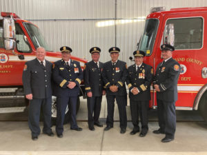 CANFIELD—A group shot of this year’s retirees. Pictured (l-r) are Ray MacNeil, retired with 15 years of service; current Deputy Fire Chief Rodger Hill; Neil Hedley, retired with 35 years of service; current Station 5 District Chief Ralph Corlis Jr; Fire Chief & Manager of Emergency Services Jason Gallagher; and Bart Barnes, retired with 27 years of service.