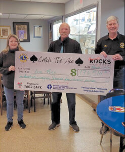 HAGERSVILLE—Hagersville Rocks Committee Member Tanya Ribbink and Lion Dan Matten present the weekly winnings to Jim Nie (centre) of Dunnville. —Submitted photo.