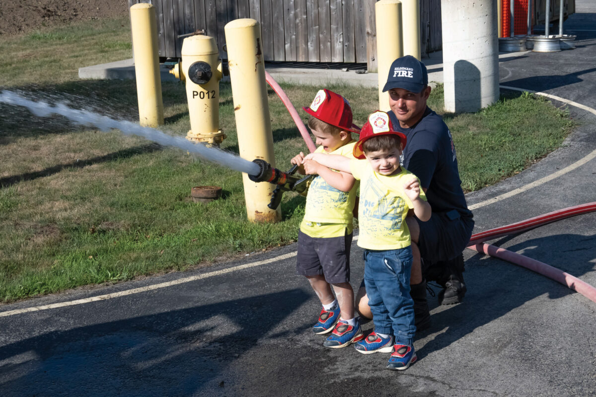 CAYUGA—Tiago Pereira, 4, and Gianni Pereira, 2, get to operate the fire hose under the direction of a Haldimand firefighter.