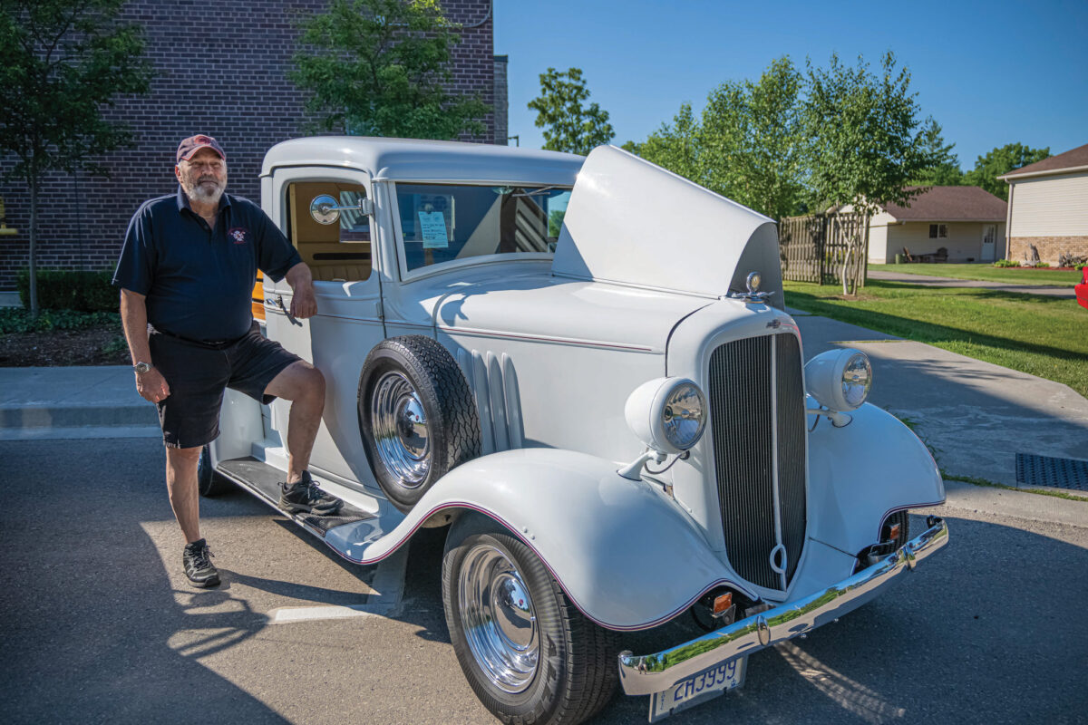 CAYUGA—Dale Bartlett shows off his 1934 Chevy pickup, a vehicle made at a time when the cab consisted of wood between the metal.