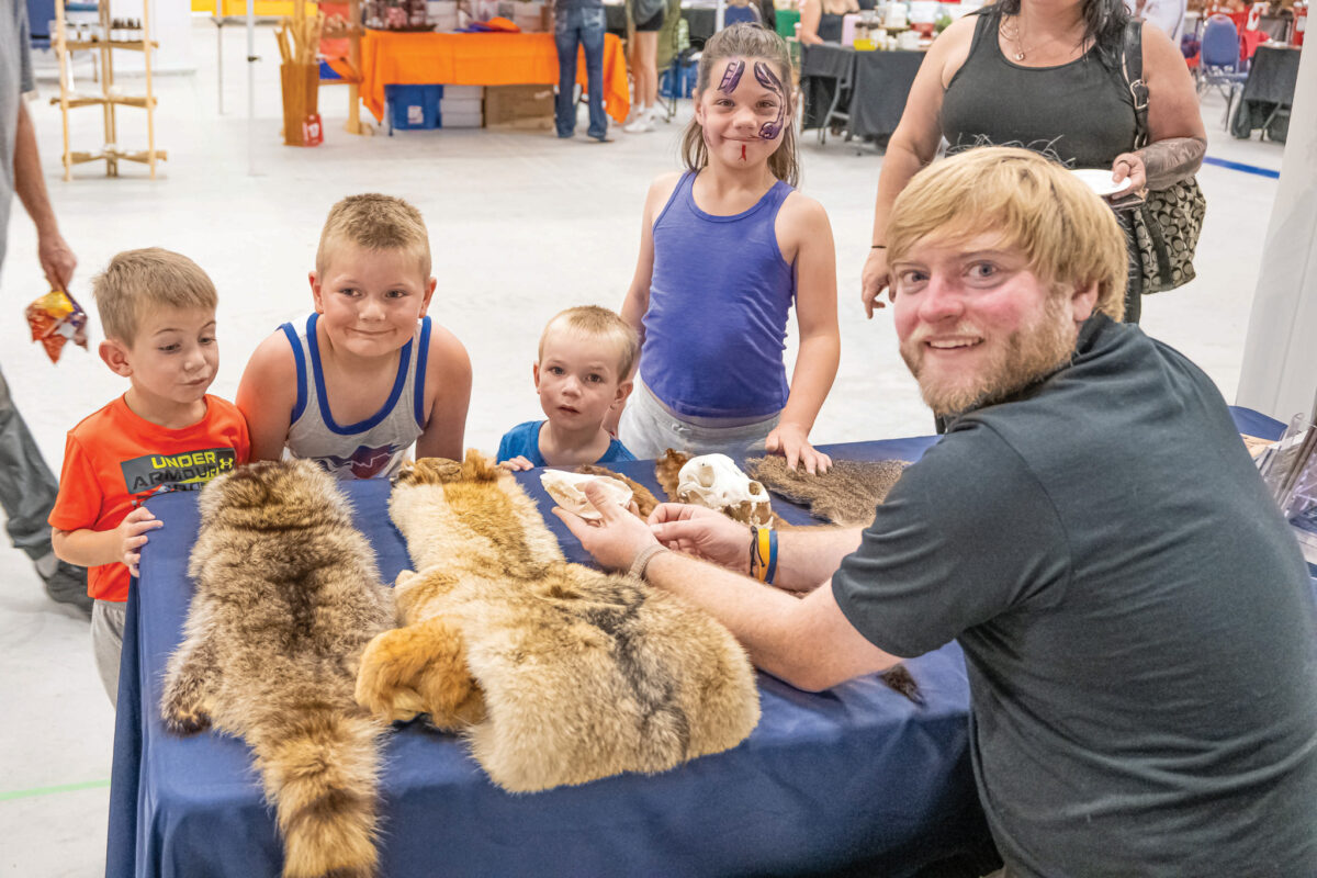 CAYUGA—Kids (l-r) Jacob Kemp, 5, Arthur Kemp, 7, David Kemp, 3, and Anna Charles, 8, examine fur pelts supplied by Michael Berry from Ruthven Park.