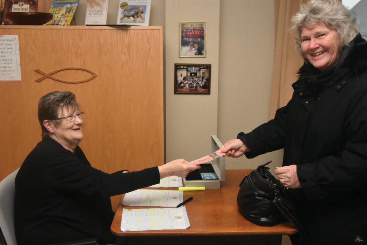 CAYUGA—Michelle Houwer of Cayuga (right) is shown paying Cayuga United Church Treasurer Elizabeth Roberts (left) for her chili supper. The $15 takeout meal included a large bowl of homemade chili packed full of flavour, a roll, a side of carrot and celery slices, and a piece of carrot cake big enough for two. Houwer said that she has attended several fundraisers for the church and the food has always been great.
