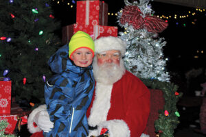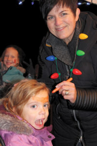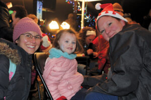 CAYUGA—The Cayuga Light Up Night on December 2 had plenty of family fun. Families were invited to have their picture taken with Santa and get their faces painted by Libro Credit Union volunteers. Cayuga firefighters collected non-perishable items for local food banks. Ouse Street South and Cayuga Street North were closed to traffic so families could explore the businesses, enjoy hot food and drinks, and take a look at racecars brought by Toronto Motorsports Park. The Cayuga Library hosted a Christmas craft, while Ruthven Park gave out homemade cookies. The evening ended with a beautiful fireworks show with Christmas music, sponsored by Haldimand Motors, along the riverbank. Committee Chair Bernadine Lutes said, “It was a huge success. The weather cooperated for us. Some people questioned whether it was still on as rain was pouring all around other areas. I think we had between 800 to 1,000 people come out.” Lutes extended “a big thank you” to the sponsors, business supporters, volunteers, and attendees. Above, Lisa and Emmi Calder of Mount Hope with volunteer Sarah at the face painting station.