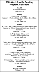 Of the cumulative projects moving forward through the program, Ward 5 drew the largest from the funding, requesting four streetlights and a radar speed sign at a total cost of $44,500. Ward 3 came second, pulling $20,000 for two radar speed signs and a storyboard in Edinburgh Square in support of the naming of Barbara Martindale Memorial Laneway. Ward 4 will see two new radar speed signs at a cost of $17,000, while Ward 2 will get one new streetlight with a $9,000 price tag. Wards 1 and 6 did not identify any projects for the 2023 program.