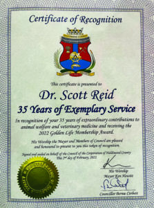 DUNNVILLE—Dr. Scott Reid has just received the prestigious Golden Life Membership award from the Ontario Veterinary Medical Association.
