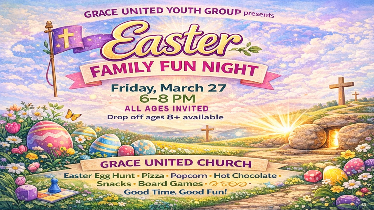 Friday, March 27. Easter Family Fun Night at Grace United Church. All ages are invited for social time and fellowship! Pizza, crafts & games for kids & adults. Easter Egg Hunt. 6-8 pm. By Donation. 174 Caithness St. E. Caledonia. graceunitedcaledonia.ca