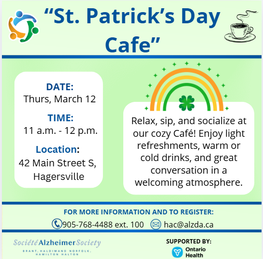 Join us March 12, 2026, at 11 a.m. for a St. Patrick’s Day Café! Relax, sip, and socialize at our cozy Café! Enjoy light refreshments, warm or cold drinks, and great conversation in a welcoming atmosphere. Whether you’re catching up with friends or meeting someone new, it’s the perfect way to unwind and connect.