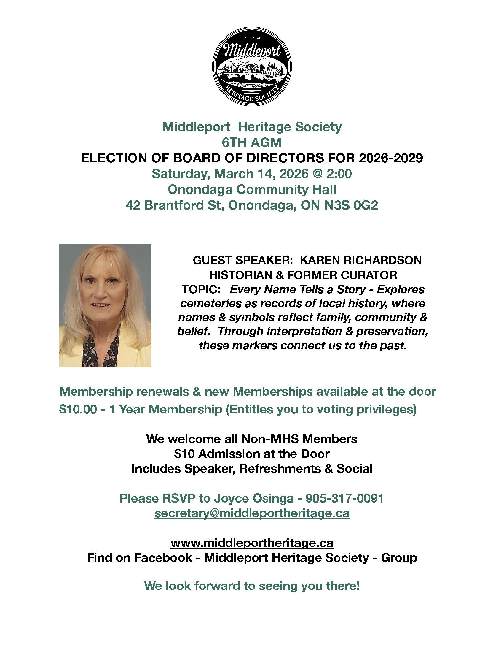 "Please join the Middleport Heritage Society on Saturday, March 14 @ 2:00 pm for our 6th Annual General Meeting at the Onondaga Community Hall, 42 Brantford St., Onondaga. Guest Speaker: Karen Richardson. Topic: Every Name Tells a Story. Everyone welcome! Free admission for paid MHS members, $10 for non-members. “