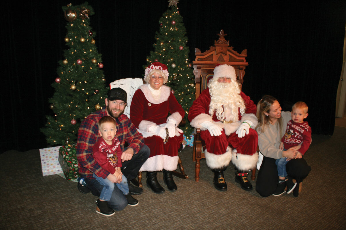 JARVIS—Children attending the Jarvis Lions Breakfast with Santa had the opportunity to get a picture with Santa and Mrs. Claus. Twin toddlers AJ and Duke Doyle were a little shy, so mom and dad joined them to capture this festive family memory. Pictured (l-r): Aaron Doyle with Duke, Mrs. Claus and Santa, and Sarah Doyle with AJ. —Haldimand Press photos by Sheila Phibbs.