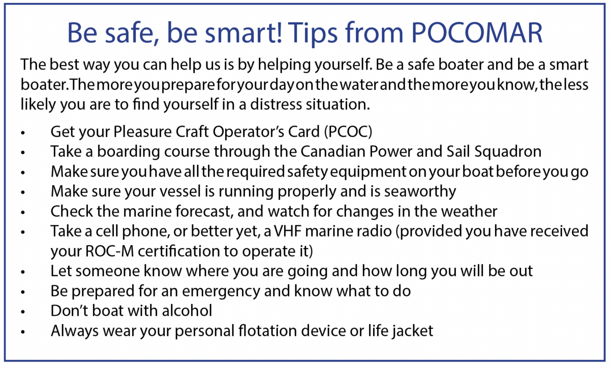 For water emergencies, reach POCOMAR on Channel 16 VHF Radio, dial *16 on a cellphone, or call 1-800-267-7270 for the Canadian Coast Guard.