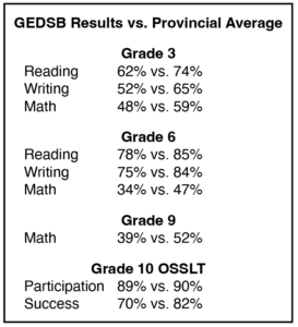 According to GEDSB, some categories saw an improvement over the last EQAO results, recorded in 2019 prior to the pandemic, including reading and writing at the Grade 6 level. However, overall, the results are well below provincial averages.