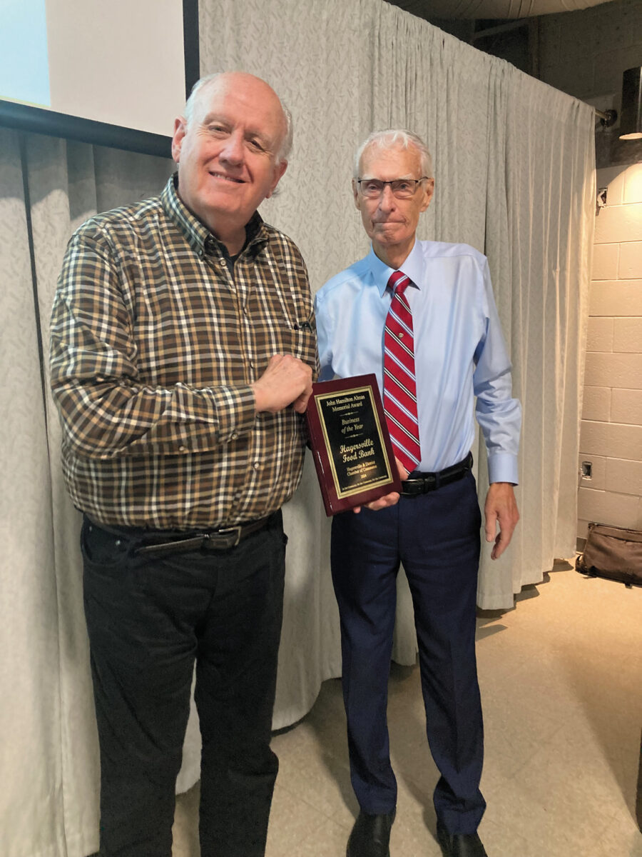 Ed McCarthy presented Pieter Wonder, Board Chairperson of the Hagersville Food Bank, with the John Hamilton Almas Memorial Business of the Year Award. When the food bank opened in 2012, they served 40 families – and today they help over 80 families. The food bank’s website shares, “The cost of food has increased our costs as well, to the point that our monthly grocery bill is surpassing $13,000…. We continue to need local support more than ever through donations and volunteers.” In lieu of flowers for this recipient, the Chamber donated non-perishable food items.
