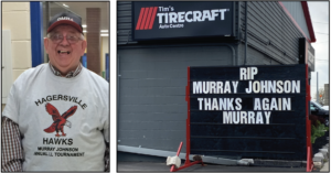 HAGERSVILLE—Murray Johnson (left) is remembered by the town of Hagersville for his dedication to local sports and youth. At right, Tim’s Tirecraft pays tribute to Johnson.