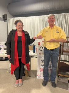HAGERSVILLE—The Thursday, January 5 Catch the Ace draw was won by Melissa Timson. Lion President Dan Matten is shown presenting Timson with her $13,339 in winnings.