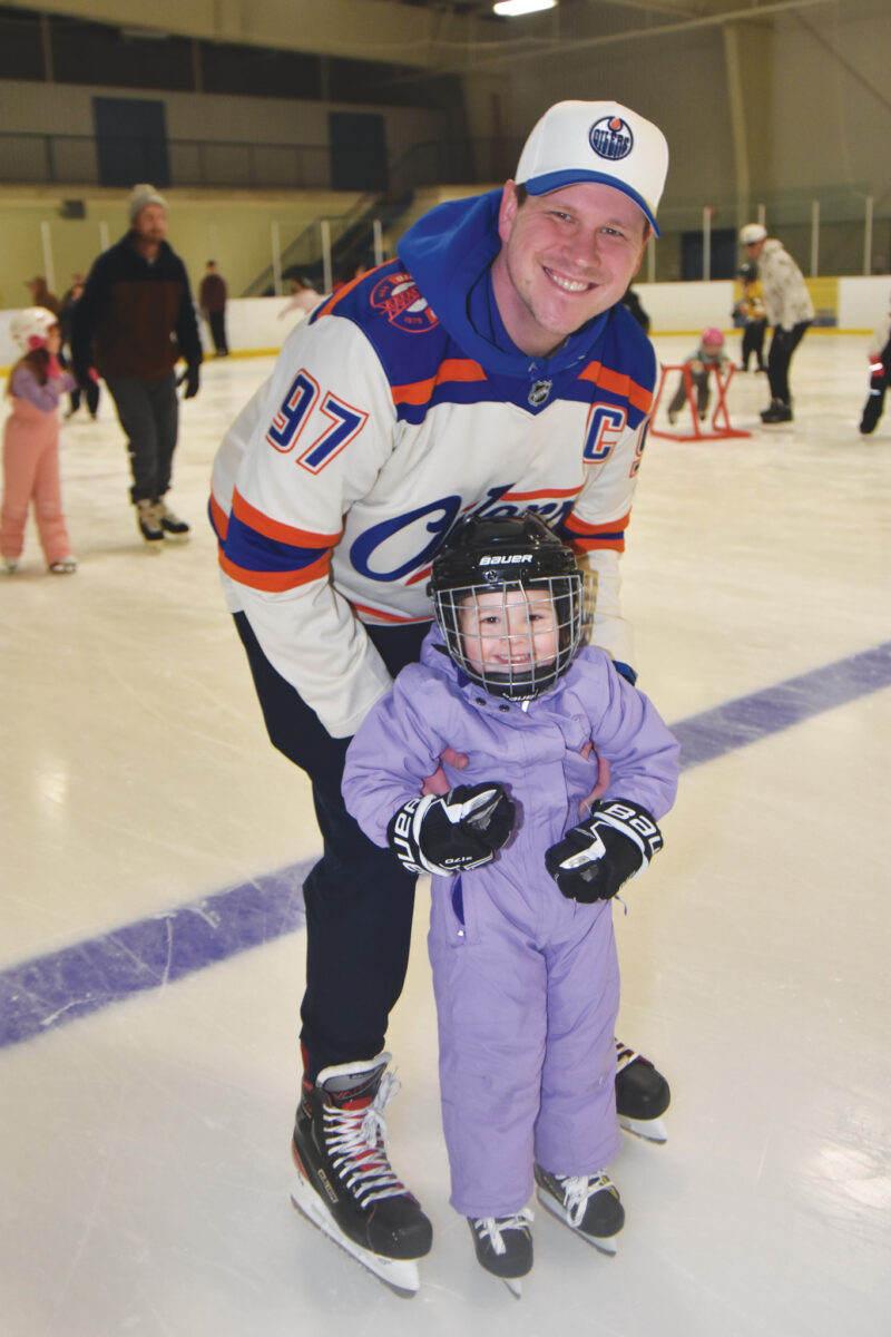 CALEDONIA—Residents of all ages are strapping on their skates to enjoy free fun on the ice, from public skates to drop-in shinny games. Above, Colin Jackson got some quality daddy-daughter time with his three-year-old at the Caledonia arena on January 3, 2026. See more photos on Page 11. —Haldimand Press photo by Kerry J Newstead.