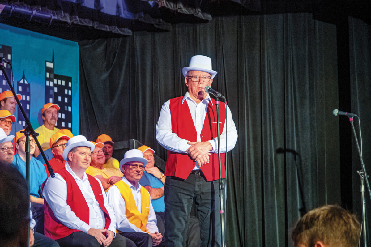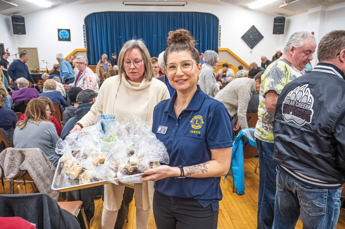 JARVIS—On opening night of the 2024 Jarvis Lions’ annual show, $1,100 dollars was raised, which will be matched dollar for dollar by the Jarvis Lions, making it a very profitable night for the refurbishment of the pavilion in the Jarvis Lions Ball Park. Shows took place from February 29 to March 2, with attendance growing each night to over 300 for the final show. A total of $4,391 was raised from the intermission sales, which will total $8,782 after the Lions’ matching donation. Above left, “Crocodile Rock” Lion Cory McBride shines brightly on stage. Above right, “Old Lady” Lion Rick Fess dressed a little differently than usual for this bit. The 69th annual show was called “Late Night” and featured a variety of songs to entertain the many visitors.