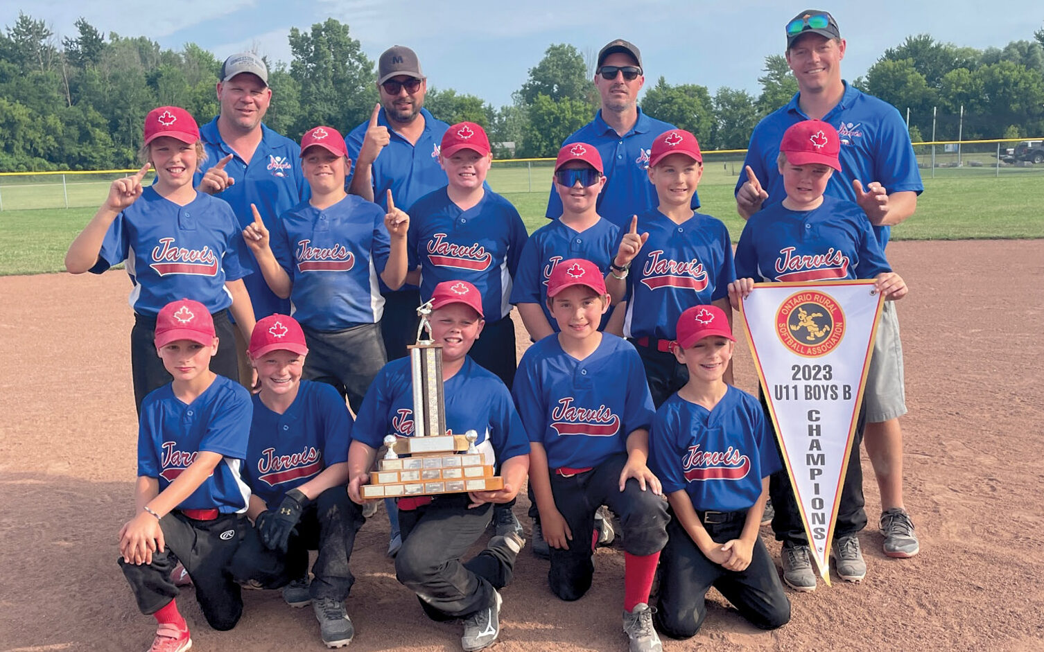 JARVIS—The Jarvis U11 Boys softball team won the Ontario Rural Softball Association (ORSA) B Division Championship this past weekend in Norwich. The boys played hard as a team, making it to the finals undefeated. They beat Springfield 15-9, Lakefield 12-11, and Fisherville 7-5 to enter the playoffs against Fisherville. The Fisherville team came into the final game strong, winning the first game 21-9 and forcing Game 2. Jarvis came back into the second game ready to play and won 17-7. Congratulations to all the players. Above is: (front row) Devin Montague, Nicholas Brown, Travis Hoskin, Davin Craddock, Beckett Rockefeller, (middle row) Tyson Lichti, Travis Gibbons, Carter Smith, Jayce Dikasz, Deacon Kraay, Liam Engelbrecht, (back row) coaches Justin Hoskin, Eric Montague, Darren Kraay, and Chuck Gibbons. Absent from photo: Nathan Armstrong, Adam and Brayden Schuurman.