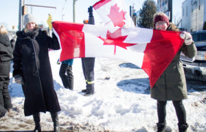 SIMCOE—Freedom convoy supporters hold up a Canadian flag during last weekend’s event.