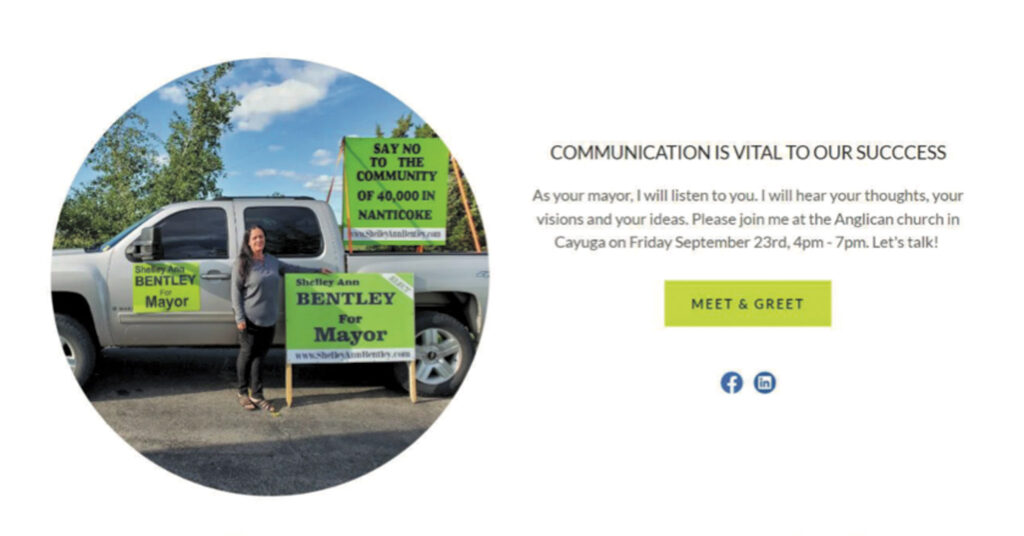 The committee questioned Bentley about the campaign link being on the signs; Bentley responded that she initially created the website as an information page related to the Nanticoke MZO, which she started in June 2022, and only later did she revamp it when her election campaign launched July 4. On why she didn’t make a new website, she said, “I couldn’t control two websites.”