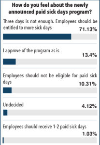 responses overwhelmingly said the measures are not enough, with 69 of 97 votes. In comparison, 13 voters approved of the program as is, 10 voters felt that employees should only be entitled to 1-2 paid sick days, four were undecided, and one voter believed employees should not be entitled to paid sick days.