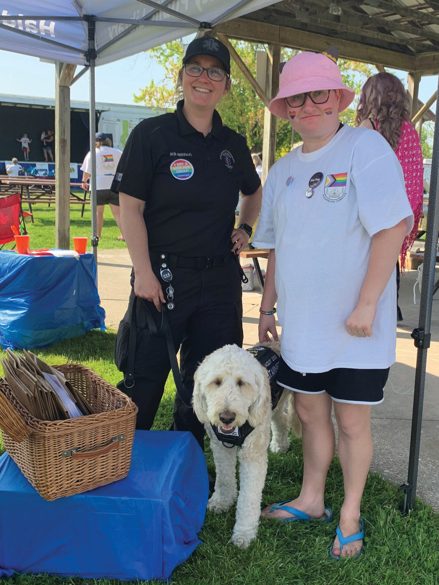 Nicole Selby, Haldimand County Paramedic, and Bekky Koiter of Dunnville, are shown with Tanner, a two-year-old goldendoodle who was trained by Autism Services in Brantford.