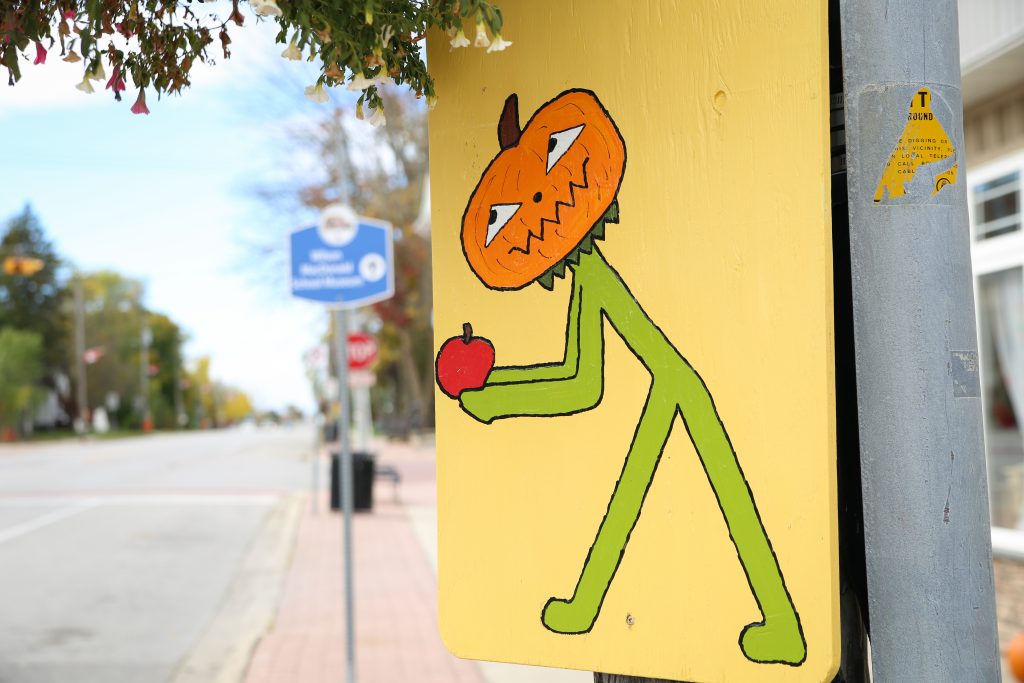 In place of the scarecrows that used to greet people along Main Street and Erie Street, there are now brightly painted signs depicting cute scarecrows with pumpkin heads in various dancelike poses.