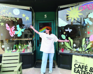 CAYUGA— McMaster art student Ardyn Gibbs strikes a pose at one of their art installations at the Carolinian Café & Eatery in Cayuga.